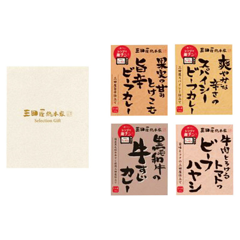 | 春の贈り物便り セレクションギフト 三田屋総本家 果実の甘みとけこむ旨辛ビーフカレー・爽やかな辛さのスパイシービーフカレー・牛肉とろけるトマトのビーフハヤシ・黒毛和牛の牛すじカレー(各180g)×各1 5,980円 数種類の果実の甘みを引き出した、後から押し寄せる香辛料の辛さが特徴の旨辛ビーフカレーと、複数の香辛料が香るすっきりとした爽やかな辛さが特徴のスパイシービーフカレー、ソースに溶け出した肉の旨味とトマトの酸味のハーモニーが特徴のこだわりビーフハ... |